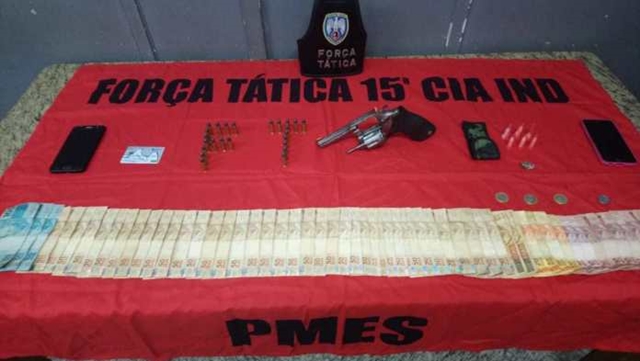 A prisão aconteceu quando os militares seguiram até a residência de um dos suspeitos com um mandado de busca e apreensão. No local foram apreendidos um revólver calibre 38, várias munições intactas, além de drogas e R$ 2.553,50 em dinheiro da venda de drogas.