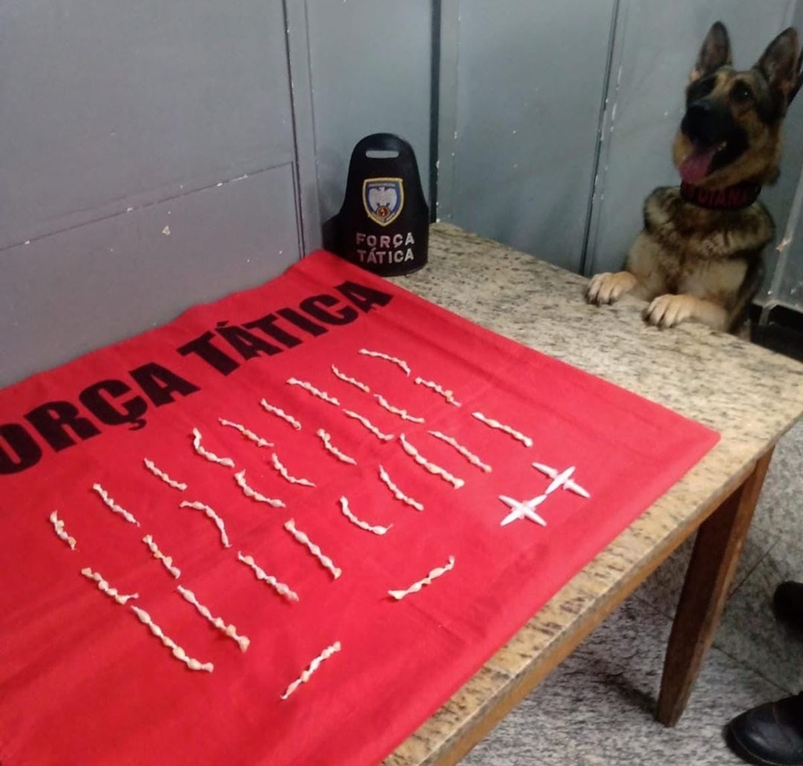 Ao realizar as buscas com a Cadela Diana, localizaram 145 pedras de crack e 8 pinos de cocaína, que estavam acondicionados dentro de uma sacola.