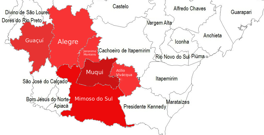 Nos municípios de Alegre, Divino de São Lourenço, Dores do Rio Preto, Guaçuí, Ibatiba, Ibitirama, Irupi, Iúna, Jerônimo Monteiro e Muniz Freire.